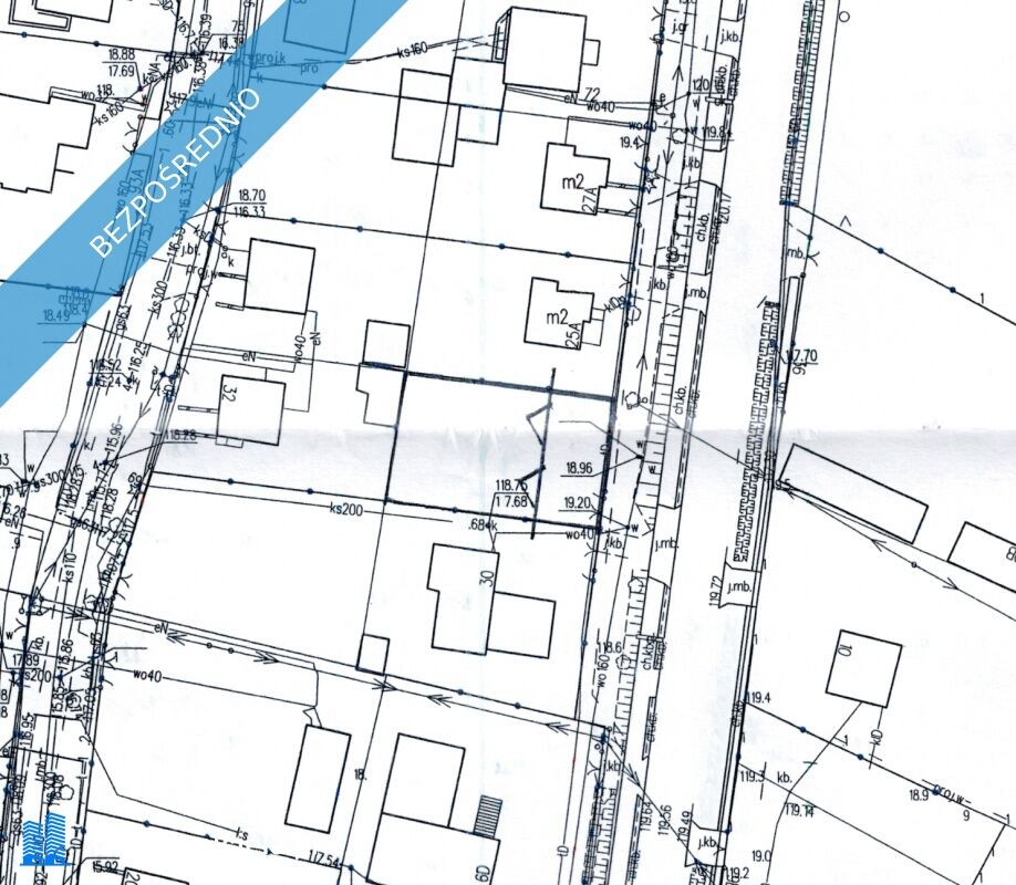 Dostęp do mediów : wodociąg – za płotem (ok. 5 m), w drodze krajowej, telefon – w działce, przy płocie, kanalizacja sanitarna – za płotem (ok. 1,5 m), na działce sąsiedniej.